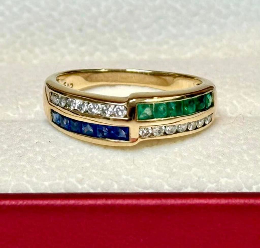 - 14K gouden ring met natuurlijke diamant, saffier, smaragd!Te koop prachtige dames ring 14 karaat geel goud met 3 verschillende edelstenen: 14 briljant geslepen diamanten totaal 0.14Ct 6 groene smaragden 6 rode saffieren ik heb een diamanttester dus kan ook zEnlèvement ou Envoi