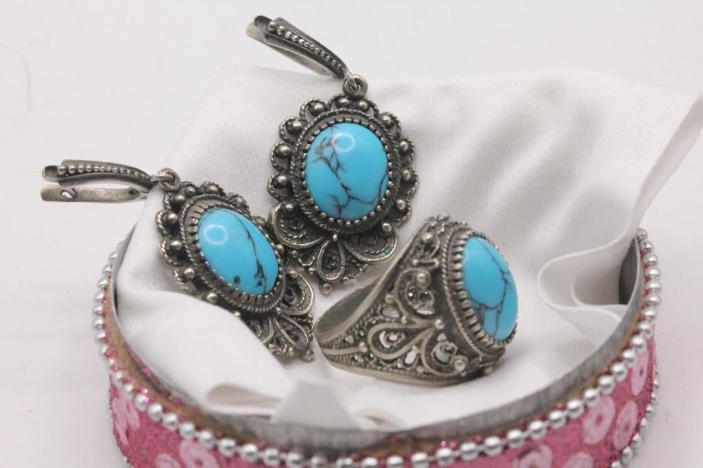 - vintage sieraden set ring en oorbellenVintage set bestaande uit een verzilverde ring met bijpassende oorbellen. Deze set is in de jaren 60 gemaakt in de voormalige ussr. Voorzien van mooi gedetailleerd filigraan werk. En rond de natuurlijEnvoi