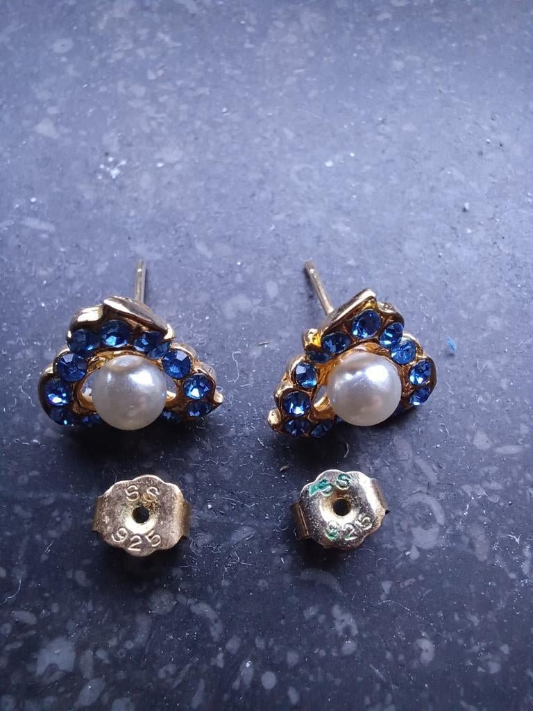 - Ravissante paire de boucles d'oreilles type puce argent 925Ravissante paire de boucles d'oreilles 925 de type puce ( clous) en forme de trèfle à 3 lobes avec pavage de cristaux bleu saphir éclatant entourant d'une perle centrale nacrée. Excellent étatComme neuf Enlèvement ou Envoi