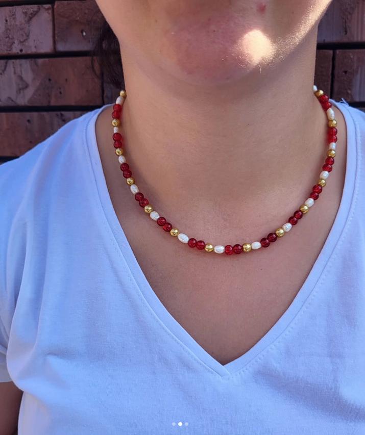 - ketting met rode en witte parels goudkleurig!Super leuke ketting met witte parels en rode parels nieuw handmade je kunt mij ook vinden op instagram robins_handmadecrafts bij interesse stuur berichtjeNeuf Envoi