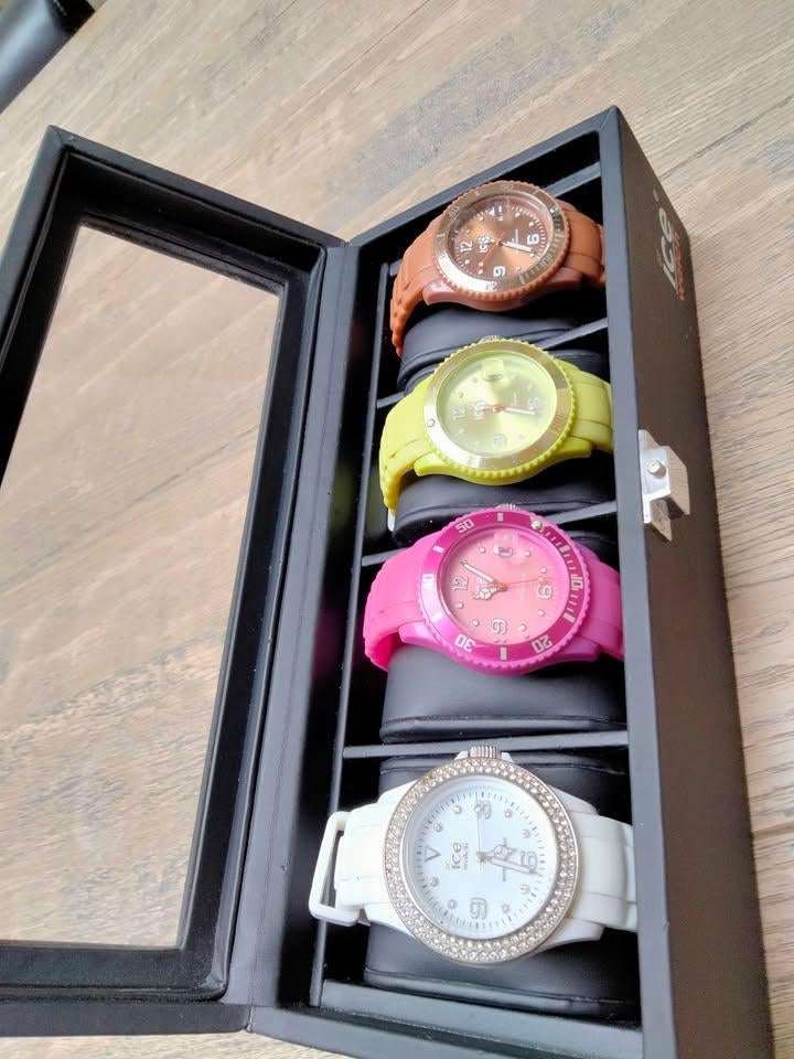 Aujourd'huiJullegheDiest - ice watch 4 stuks4 x ice watch. Nieuw batterijtje nodig (kan je goedkoop laten vervangen op de markt!). Bruine kleine beschadiging aan glas.Utilisé Enlèvement ou Envoi