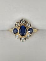 18 janv. 26m-rCourtrai - Bague - 14 carats Or jaune Saphir - DiamantBague vintage en or jaune 14 carats, sertie d’un saphir ovale facetté d’environ 0,50 ct entouré de dix diamants naturels en taille single-cut d’un total d’environ 0,05 ct, montures en chaton ouvert, t