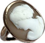 - Ring - 9 kt. Roségoud - Gesigneerde Schmoll CameoPrachtige victoriaanse signerede schmoll schelpcameo-ring gezet in 9kt roségoud. De camee is in reliëf uitgesneden uit een schelp, met een profiel van godin flora. De schelp lijkt een lichte kleur te
