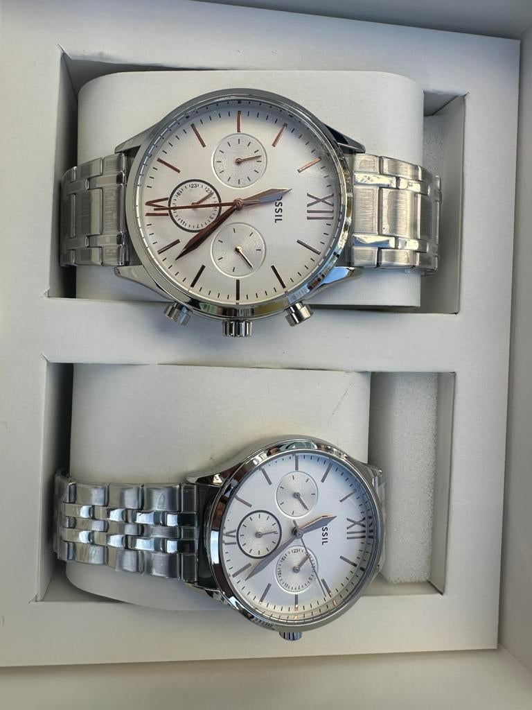 - Montre Fossil pour Elle et Lui en argentMagnifique coffret de 2 montres fossil pour elle et lui en argent avec une touche de doré. Jamais porté, neuf.Neuf Enlèvement ou Envoi