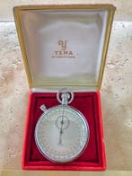 - Yema - Unknown - 1960-1969Yema manueel opwindbare zakstopwatches in een roestvrijstalen kast groter dan 50 mm, met een witte wijzerplaat met rode seconden schaal en een 12 uur minuten subdial, verkocht in 1970 in villejuif met