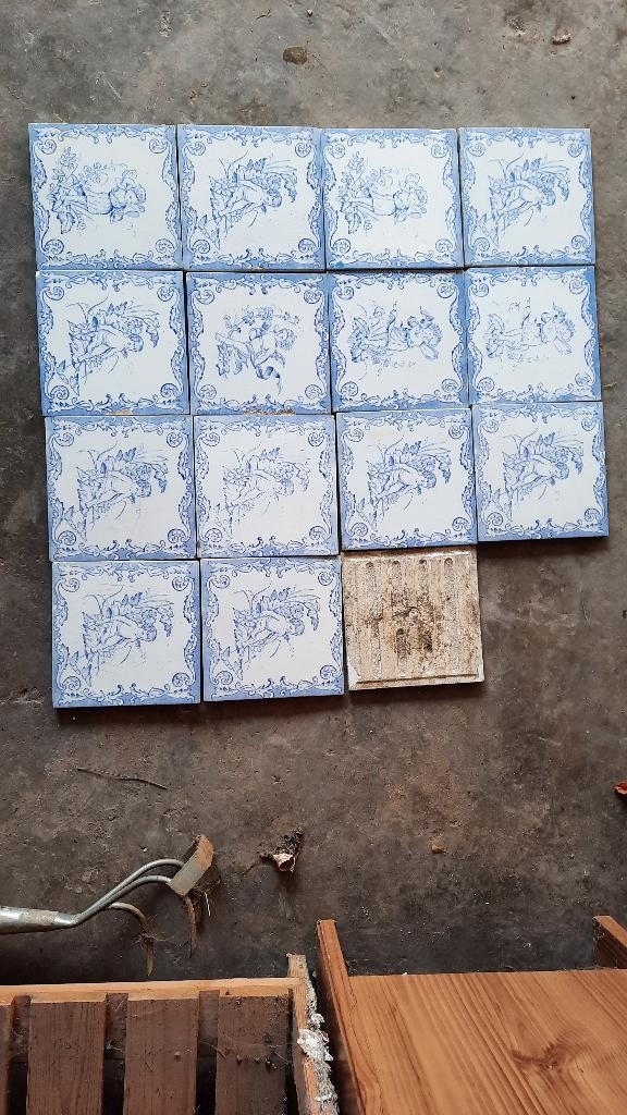 26 mars 26Ineke en erwinVlamertinge - Anciens carrelages Delft début du siècle +/- 1900Lot de 15 carrelages delft en bon état + 12 carrelages delft un peu abîmés + chutes carrelages.Utilisé Enlèvement