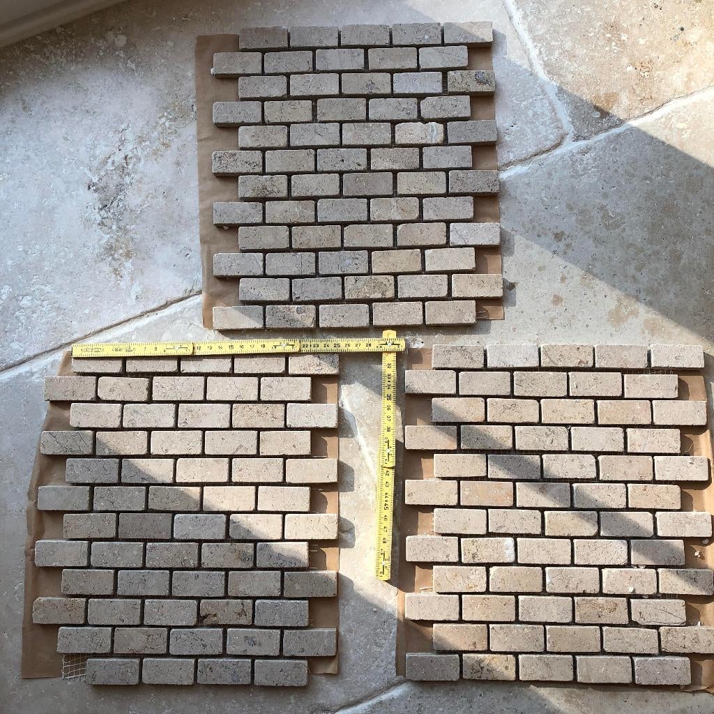 - Mosaïque en travertin - pierre naturelleMosaïque en travertin pierre naturelle beige (4.5X22) sur natte tressée 3 pièces de 25 x 25Neuf Enlèvement