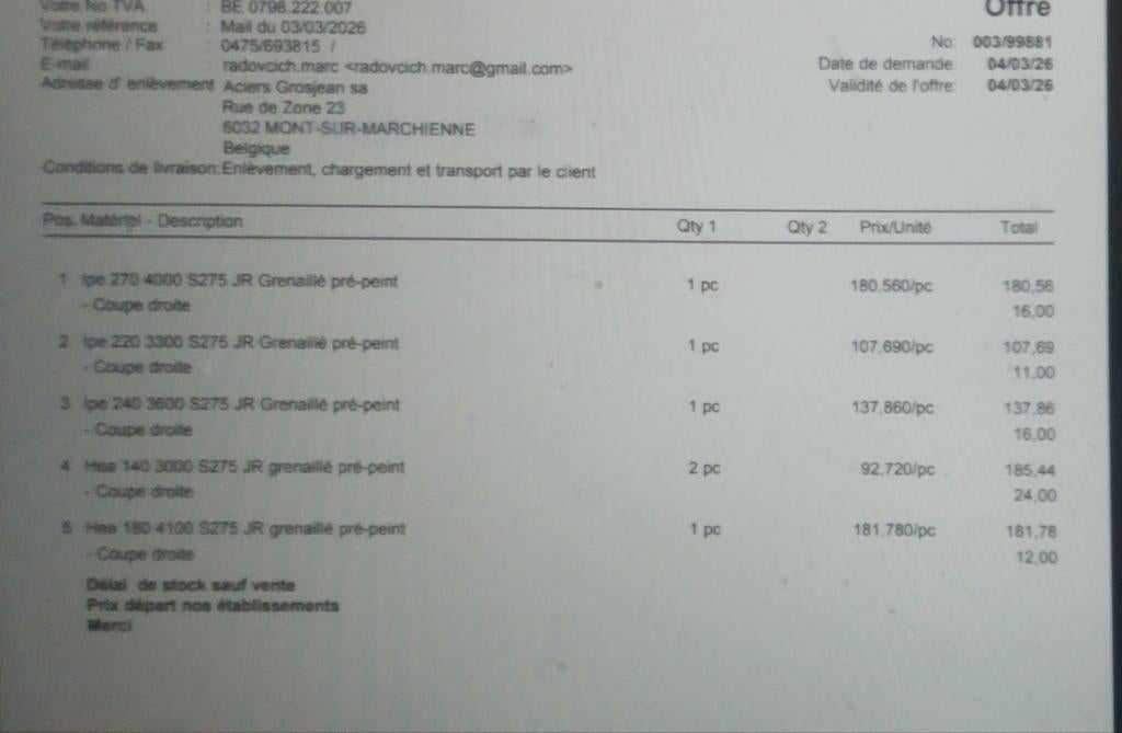 28 mars 26JackFlorennes - POUTRELLESPoutrelles ipe 360 longueur 5,00 m : 420 € (photo 6 et 7) hea 200 longueur 2,50 m (rouillée) : 110 € (photo 3) heb 120 longueur 2,05 m : 55 € (photo 7, à gauche))Enlèvement