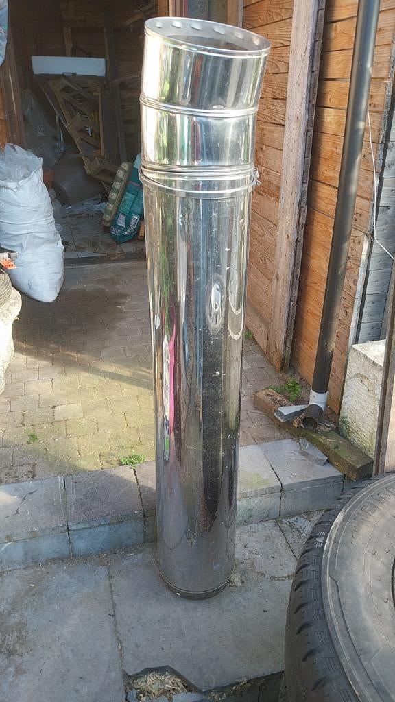19 mars 26MaikelOverpelt - Conduit de fumée en acier inoxydable à double paroi- composé de 2 canaux de fumée isolés à double paroi, mesurant chacun 1 m. Diamètre 20 cm - embout en acier inoxydable 20/25 cm - anneau de tension - plaque de toit (légèrement endommagée mais peut êtUtilisé Enlèvement