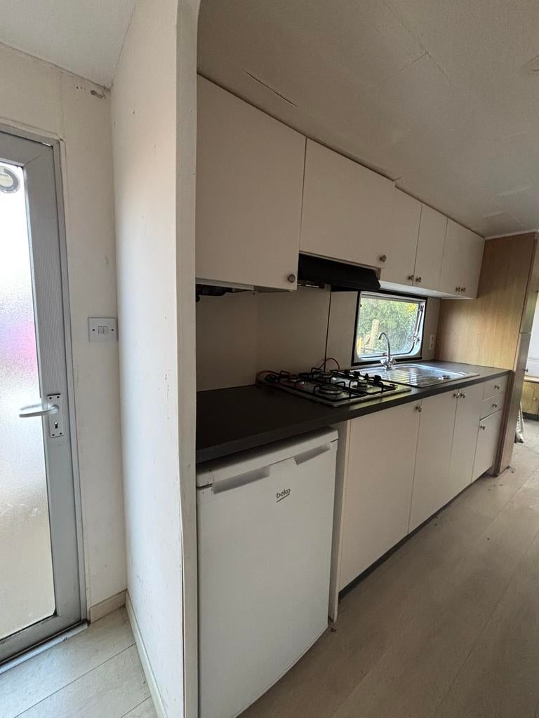 HierTiffanyHeule - Stacaravan te koopStacaravan 9m x 3m leefruimte met keuken badkamer met douche/klein bad, lavabo en toilet 2 slaapkamers nieuwe doorstromer en gasleidingen geplaatst in 2025 door stormschade zit er een gat in het dak.