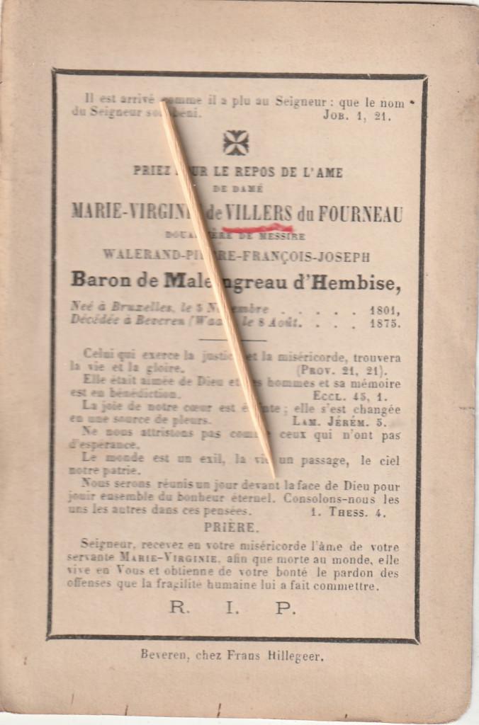 - Carte de prière Adel Beveren-WaasBruxelles-beveren-waas, 1875, dame marie de villers du fourneau, douairière du baron de maleingreau d'hembiseEnvoi
