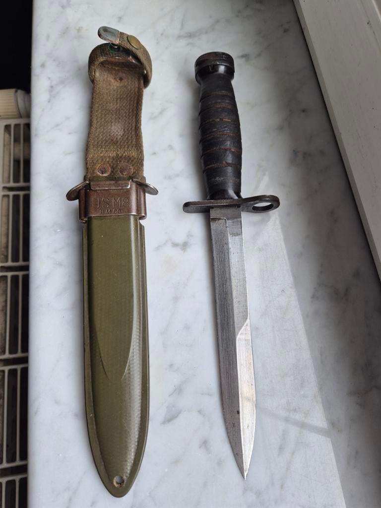 29 janv. 26ardennesjustinDinant - Baïonnette US M5 avec étui M8A1Baïonnette de la période de la guerre du vietnam. Bon état avec quelques signes d'âge.Enlèvement ou Envoi