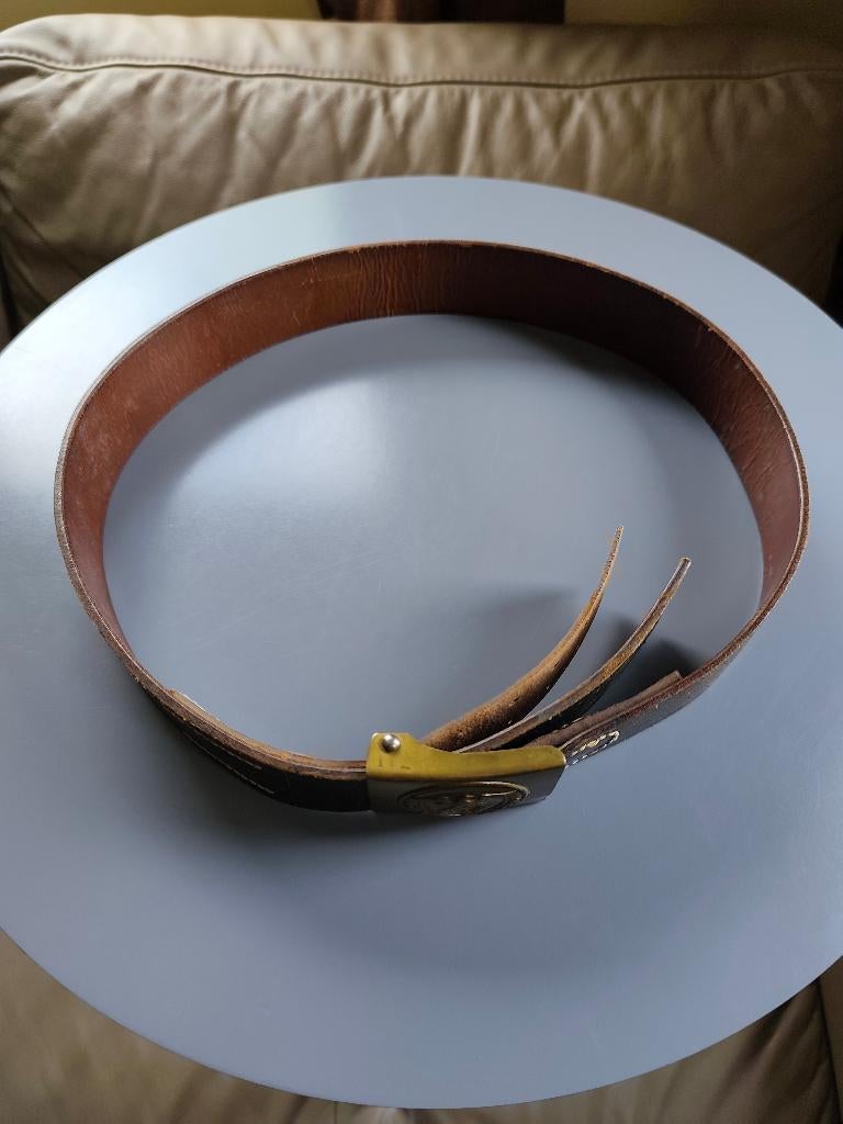 25 juil. 24HubertBeloeil - Ceinturon officier LW. Luftwaffe officer belt ww2Ceinturon d’officier luftwaffe. En cuir marron. Boucle à deux ardillons, en métal grenelé. Passant présent. Taille 110. Sans marquages visibles. A noter une certaine usure et patine de la pièce.Enlèvement ou Envoi