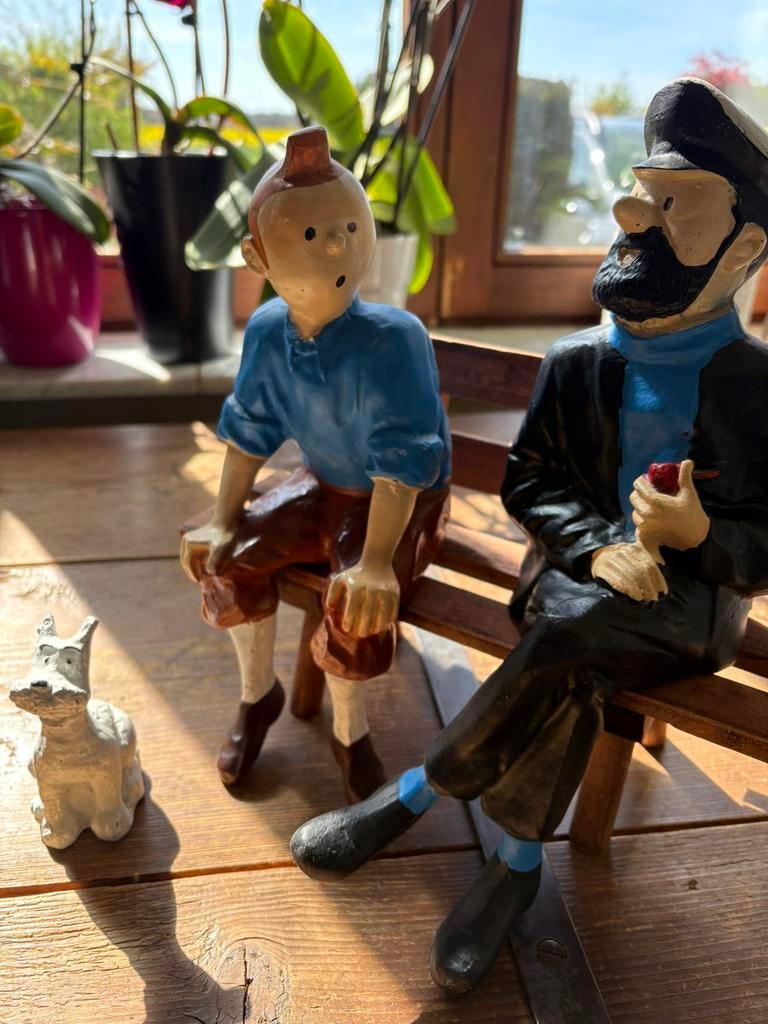 - TINTIN MILOU HADDOCK SUPERBE COLLECTOR IMPECCABLEEn excellent état. Tintin et haddock en résine milou en plâtre (?) Le banc est en bois région andenne 5300Comme neuf Enlèvement ou Envoi
