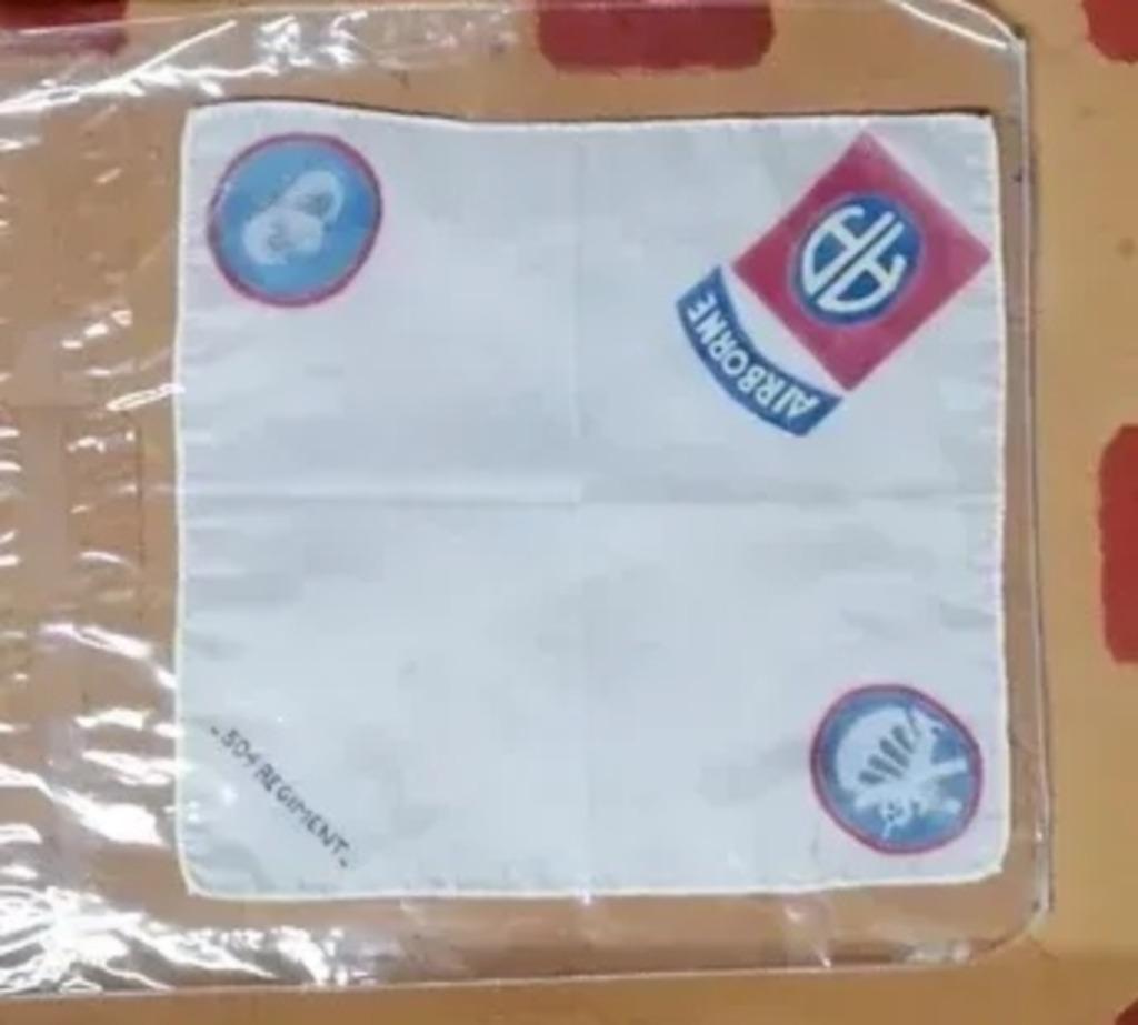 18 mars 26wilcoWoluwe-Saint-Pierre - Mouchoir soie militaire 504 regiment infanterie parachutisteRare mouchoir en soie airborne, du 504ème regiment infanterie parachutiste us américain ww2. Peinture sur soie de parachute us, insigne parachutiste, insigne infanterie planeur glider, insigne 82ème aEnvoi