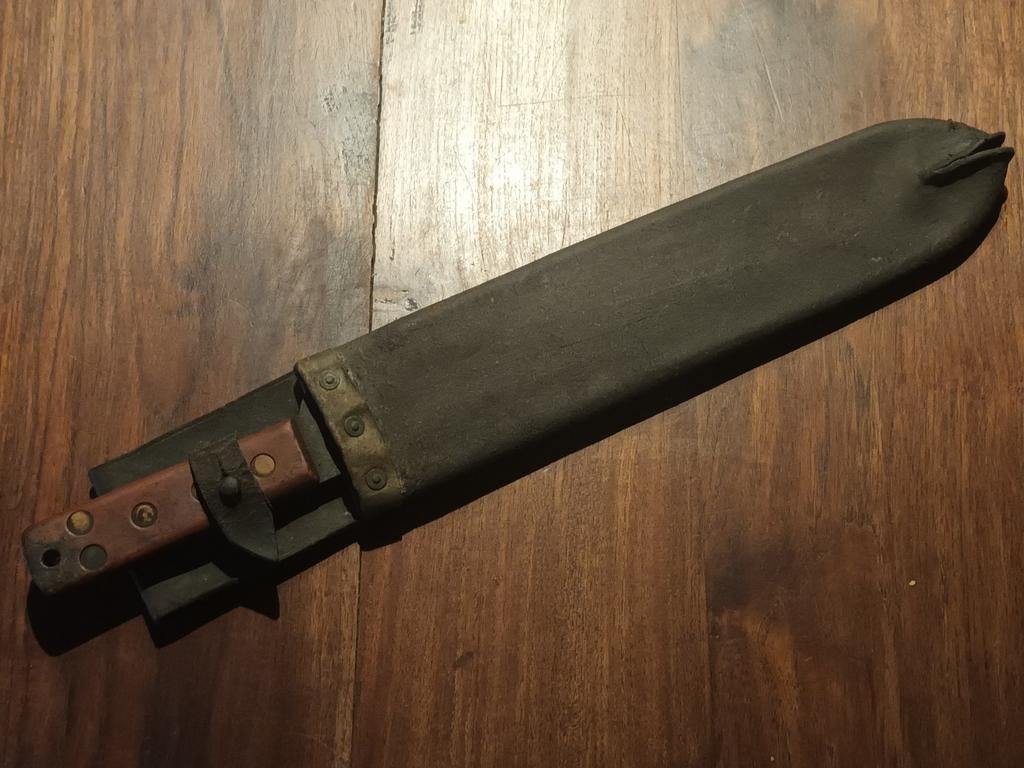 HierGio.Genk - machette us de 18 avec fourreau en cuir manche en boisMachette us de 18¨ avec fourreau en cuir manche en bois l ensemble est en bon etat le bois n est pas vermoulu le modèle mis en vente a la particularité que le manche est en bois peint en kaki (d origiEnlèvement ou Envoi