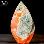 Météorite flamme en calcite orange, combinaison rare de calcite orange avec des inclusions d’apatite bleue, originaire du brésil, dimensions 130 mm de hauteur, 70 mm de largeur et 35 mm de profondeur