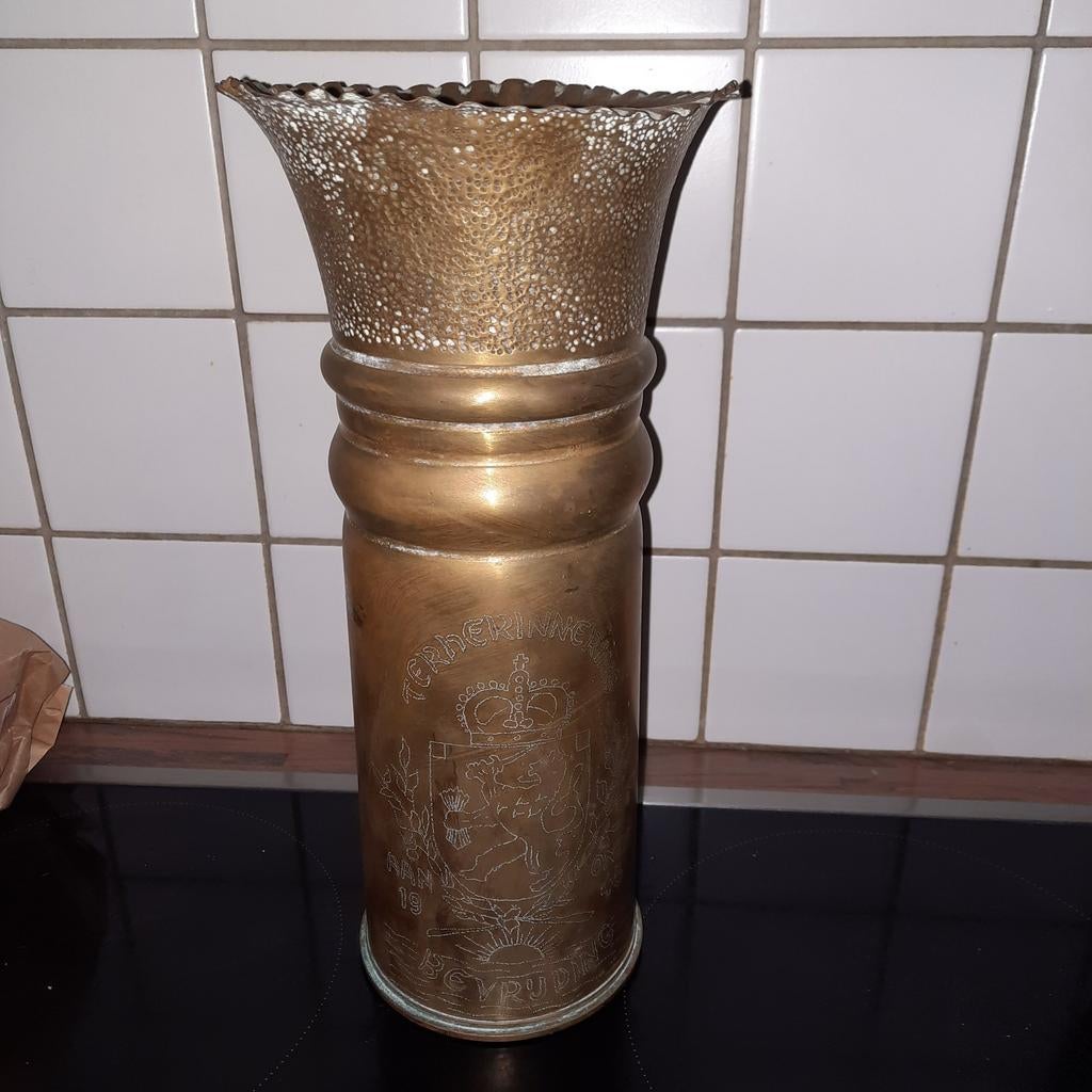 23 févr. 26puyveldekenBelsele - zeldzame grote WO1 trench art obus 1918 overwinning 50cmObus van oktober 1918 uit de patronenfabrik karisruhe. Sp255 d. Vrij naïef uitgesneden. Wat deze obus bijzonder maakt is de aangebrachte centrale plaque van koning albert 1. In zeer mooie staat. DiameEnlèvement ou Envoi
