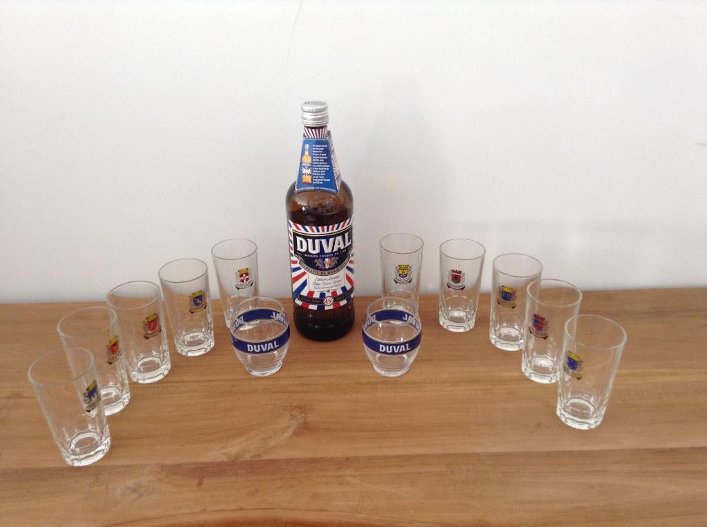 Avant-hierPub au topemailleToute la Belgique - Pastis Duval Edition Limité 1L. + 12 verresPastis duval non ouvert 1l avec 10 verres ecusson ville de france. + 2 Verres duval ballon.Neuf Enlèvement ou Envoi