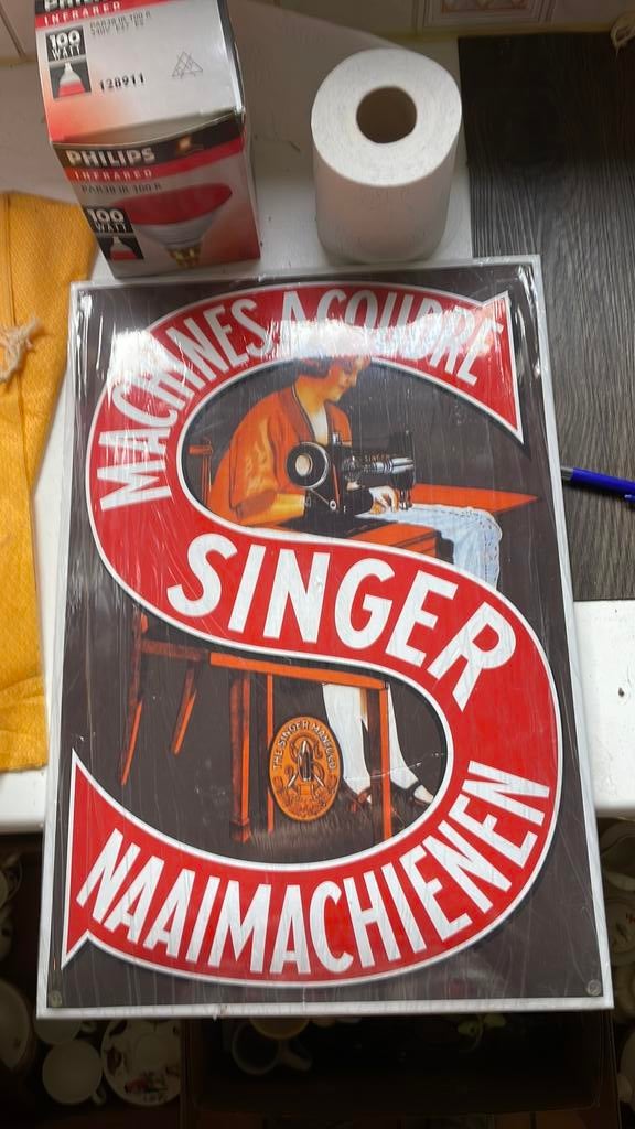 20 janv. 26Huis vol vintageBaarle-Hertog - Plaque émaillée SINGER vintage – machine à coudreAuthentique plaque émaillée publicitaire singer, célèbre marque de machines à coudre, emblème du savoir-faire et de l’industrie du xxᵉ siècle. 👉 Superbe émail d’époque avec une patine authentique : éEnlèvement
