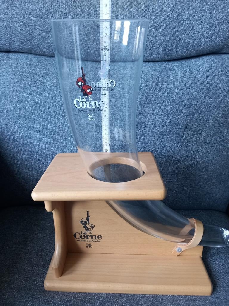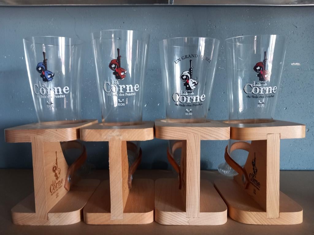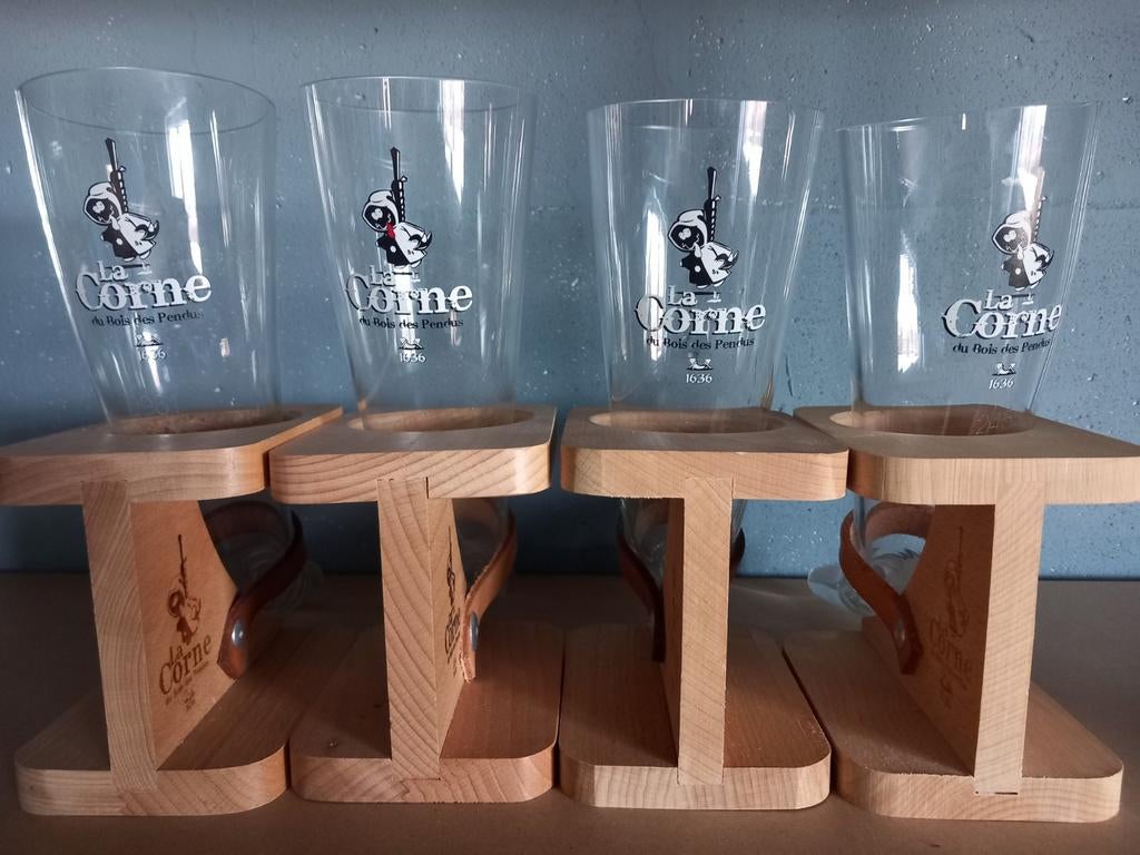HierRainyBilstain - Verres à bière originaux La Corne et KwasVerres à bière en parfait état et originaux sur socle en bois. La corne 2 x kwak pauwels 1Neuf Enlèvement