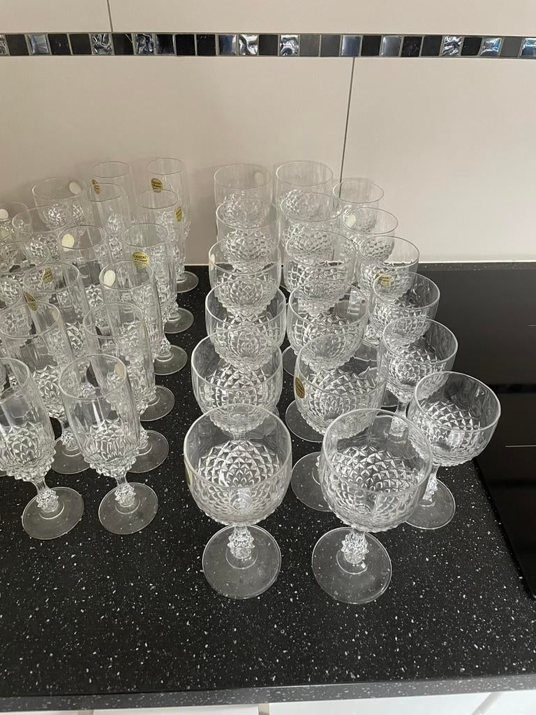 - Verres en cristalNouveaux verres en cristal de christal d'arques 12 coupes à champagne 12 verres à vin blanc 12 verres à vin ronds 12 verres à cognacNeuf Enlèvement