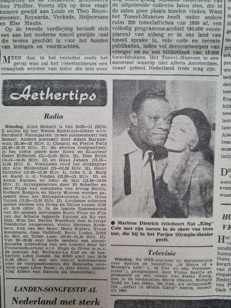 - Marlene Dietrich feliciteert Nat King Cole (1960)Pagina uit de goudsche courant van maandag 25 april 1960 met een foto van marlene dietrich die zanger nat king cole feliciteert met zijn succes in de show in het parijse olympia-theater.Enlèvement ou Envoi