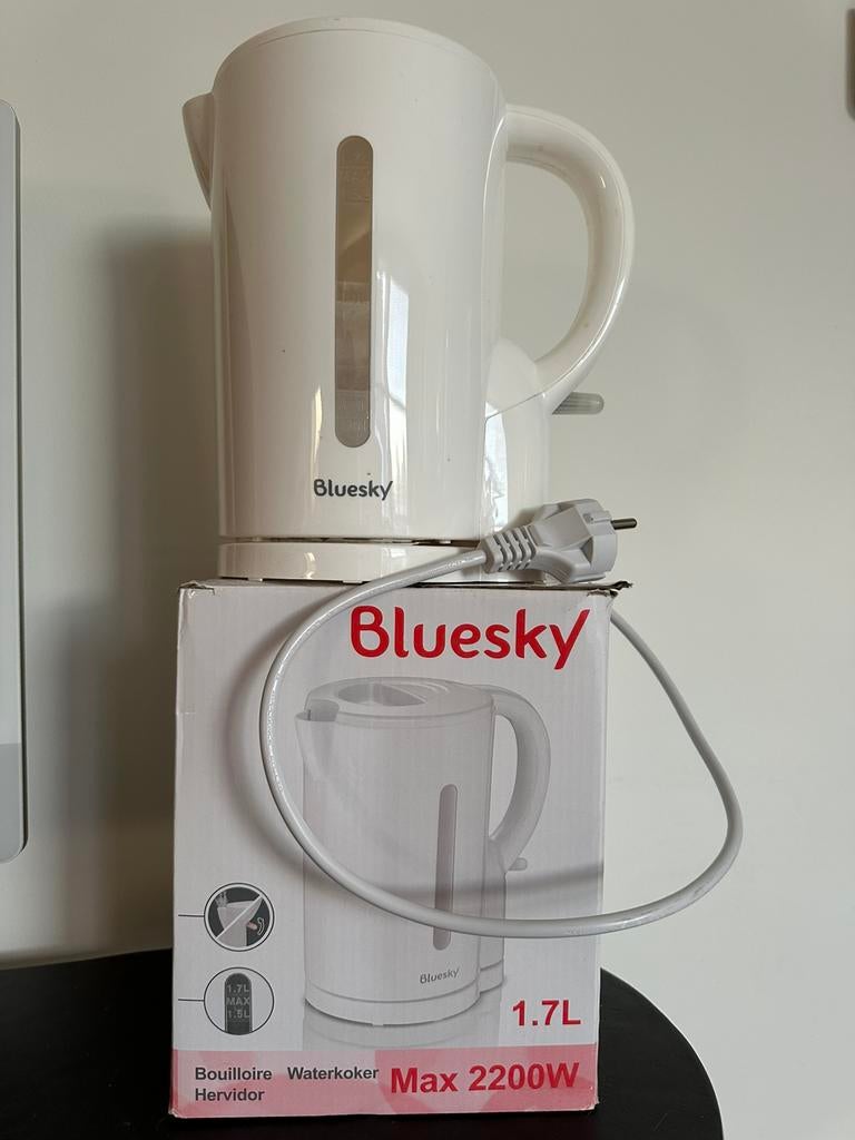 - Bouilloire électrique BlueskyCette bouilloire électrique bluesky (modèle bwk18-18l) est un appareil de cuisine pratique pour faire bouillir de l'eau rapidement. Capacité : 1,7 l. Puissance : jusqu'à 2200 w pour un chauffaComme neuf Enlèvement ou Envoi