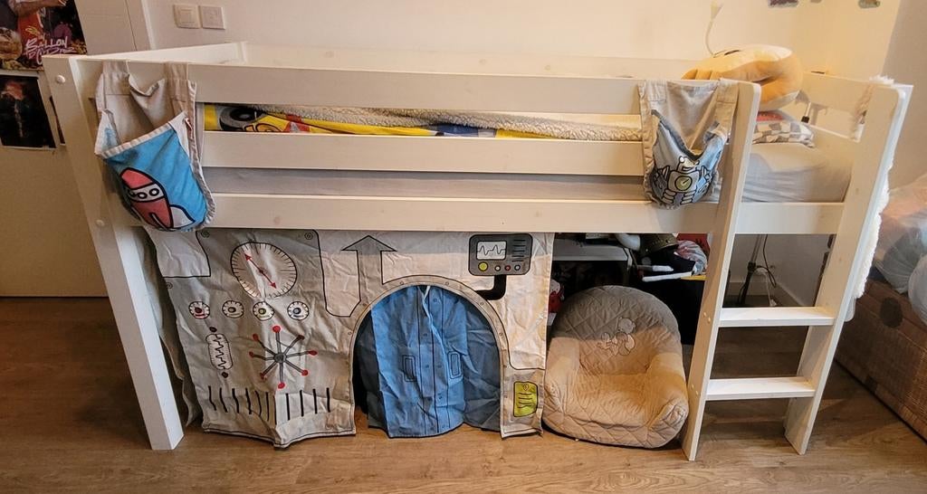 19 mars 26antSchaerbeek - Lit mi-hauteur Flexa et tobogganLit mi-hauteur flexa 120 cm avec toboggan et échelle, 90x200 cm. Avec petite cabane rose au-dessus du lit. Le matelas n’est pas inclus.Enlèvement