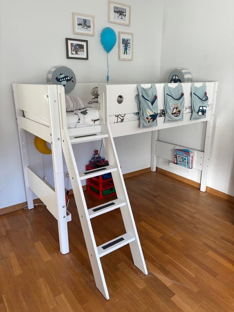 HiermagalidecoSint-Stevens-Woluwe - Lit mezzanine Flexa 143 cm (90 x 200)Lit pour enfant flexa avec escalier. Il mesure 143 cm de haut et est livré avec un support de sécurité. Il présente des signes d'usure mais est toujours en bon état. Certainement toujours très robUtilisé Enlèvement