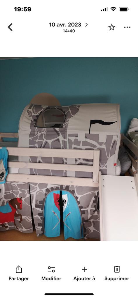 4 mars 26MagaliUccle - Lit en bois blanc avec tente et tobogganLit en bois peint en blanc (entre-temps à été démonté) - matelas 2000x900mm - lattes fixes portent le matelas - tente avec porte escamotable, ouverture de fenêtre et poches de rangement, composée de 3Utilisé Enlèvement