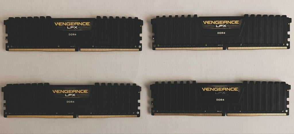 - RAM kit 64GB (4x16GB) Corsair VengeanceRam kit 64gb (4x16gb) corsair vengeance ddr4 hoge snelheid van 3000 mhz wordt verkocht wegens upgrade. Bieden is toegestaan maar hou het respectvol.Neuf Enlèvement ou Envoi