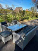 - Ensemble meubles de jardinEnsemble meubles de jardin tressé couleur grise structure métal composé d’une table plateau en verre 145x85 , d’un canapé 3 places 190x78 de 2 fauteuils 78x78 et de 2 poufs 56x51 coussins gris foncé pUtilisé Enlèvement