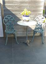 - table et 2 chaises Paris BistrotBelle table aux bords arrondis et 2 chaises pliantes de style paris bistrot. Prise en charge à ostende.Comme neuf Enlèvement