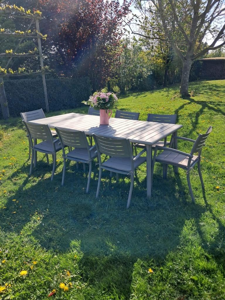 - grande table de jardin en alu2m x 1m avec huit chaises et leurs coussins table facile à nettoyer/entretenir, légère à déplacer et solide en même tempsEnlèvement