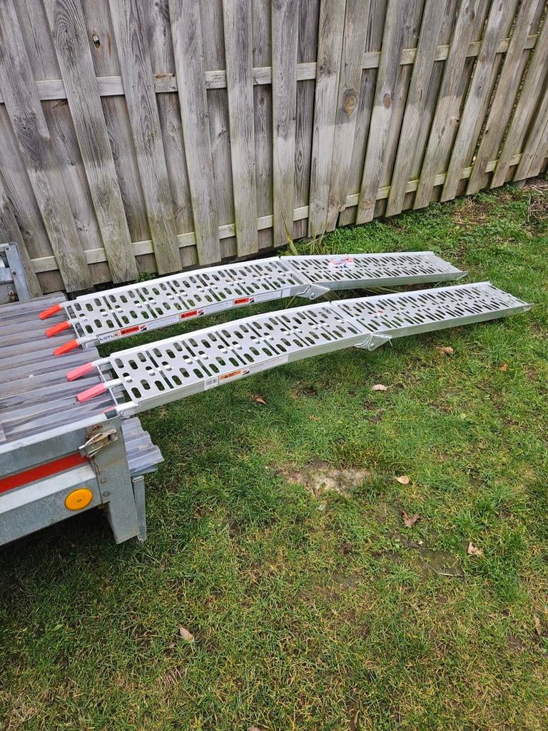 - Rampes pliables pour tondeuse à siège - 2 pièces en HouthaleNouvelles rampes pliables en aluminium pour tondeuse à siège longueur = 226 cm capacité de charge 340 kg par pièce x2 = 680 kg prix par pièce 100 euros 2 pièces pour 180 euros nouveau, jamais utiliséEnlèvement