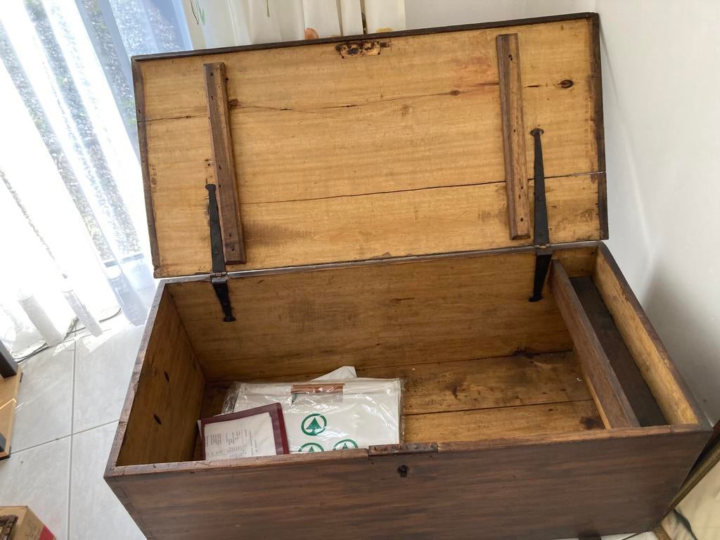 HierMichaël LawarréeAywaille + Partie De Rouvreux - Coffre ancienAncienne boîte avec couvercle à charnière. L x l x h = 770 x 475 x 485 dimensions extérieures en mm epaisseur du bois 10 mmUtilisé Enlèvement