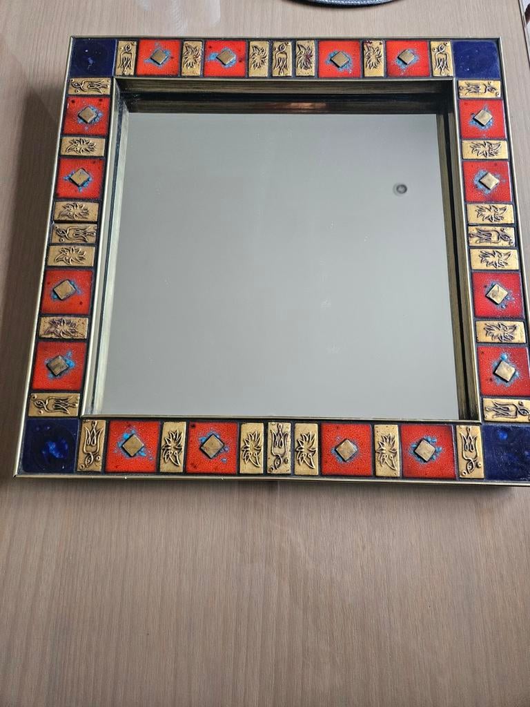- splendide miroir vintage des années '70Miroir vintage est une pièce décorative des années 1970, design rétro. Modèle carré.un cadre orné de carreaux en céramique émaillée rouge vif et bleu profond, séparés par des plaques en relief doréesEnlèvement