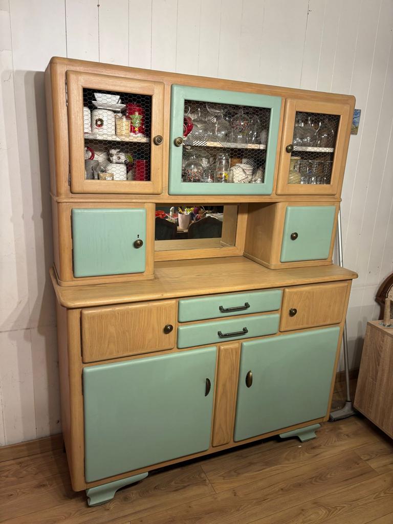 Aujourd'huiMaite VasseurMouscron - Buffet de cuisine style MadoBuffet de cuisine composé de 2 parties, datant des années 1945-1950, remis à neuf., La couleur peut être modifiée si l'acheteur le souhaite.Comme neuf Enlèvement