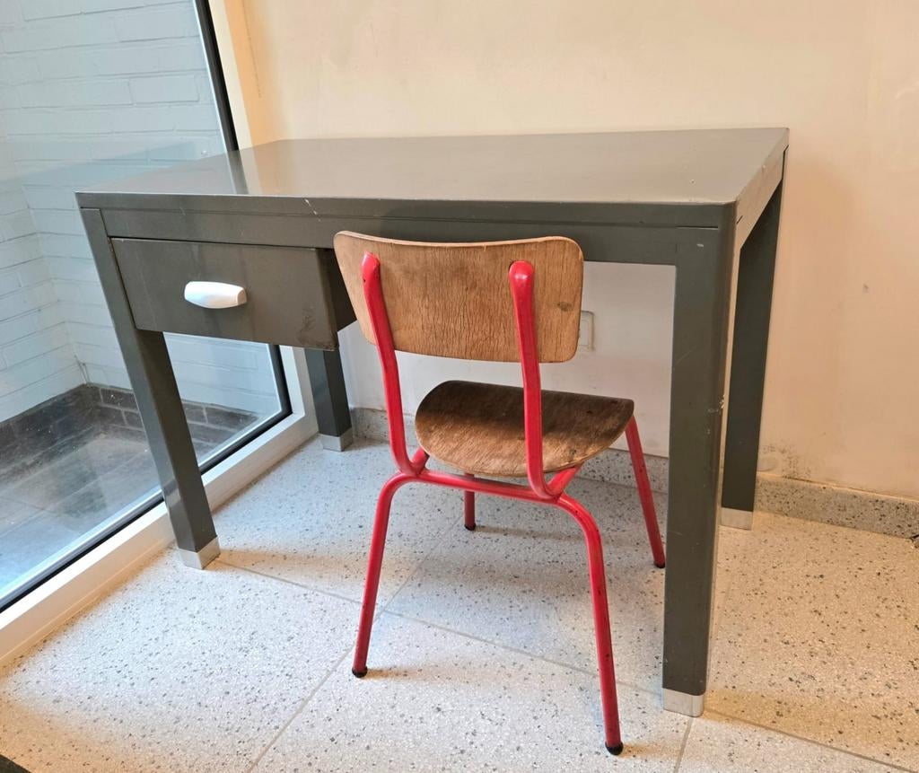 Aujourd'huiNielsAKontich - Bureau métallique vintage pour enfantBureau métallique vintage pour enfant. Longueur 110 cm, largeur 60 cm et hauteur 69 cm.Utilisé Enlèvement