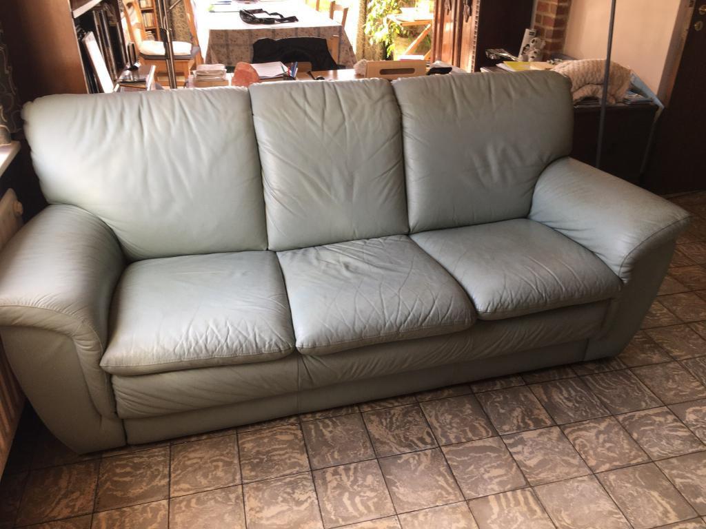 - Faiteuil en cuir vert/grisCanapé 3 places et 1 fauteuil 1 place de couleur vert/gris. Ils sont usés mais peuvent encore bien servir.Utilisé Enlèvement Autres dimensions