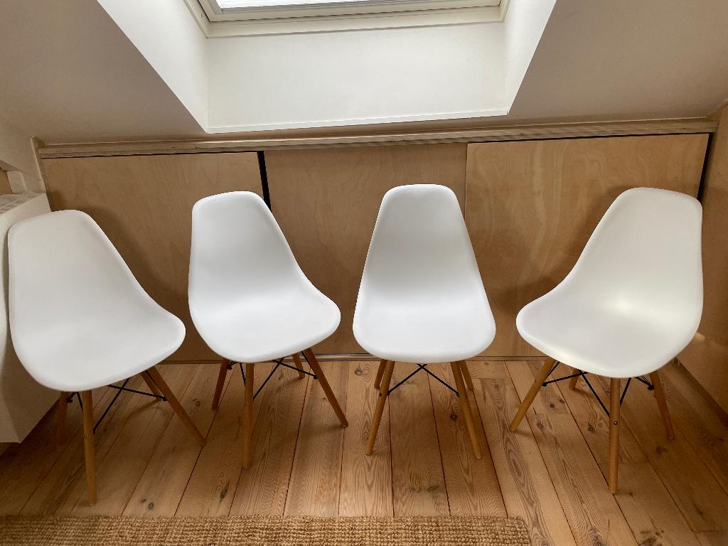 16 avr. 26michiels krisScherpenheuvel-Zichem - Set van 4 witte Eames-stijl buitenstoelenTijdloze set kuipstoelen met armleuning in iconisch design. Kleur: wit met houten onderstel (beuken-look). Staat: in zeer goede conditie. Stevige en comfortabele zit. Extra: de poten zijn voorzien vanComme neuf Enlèvement