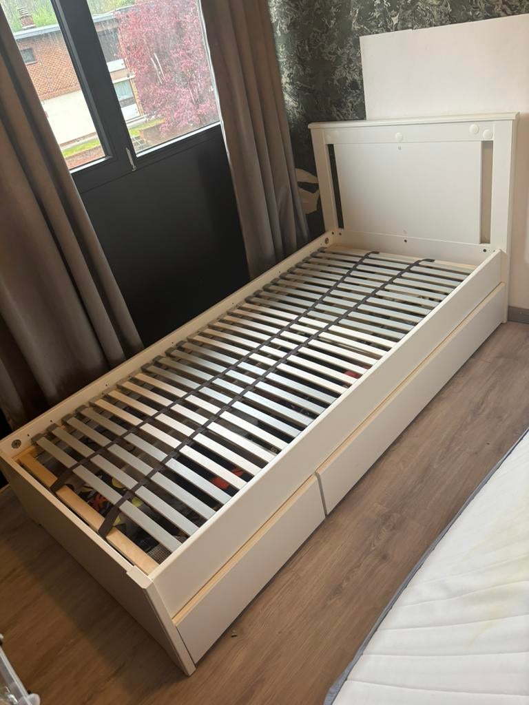 14 mars 26KERFSRixensart - Réservé —— Lit tiroir Ikea « slakt »: 2x1personneLit ikea slakt 2x90 /200 et 2 tiroirs de rangement. Peu utilisé et protège - matelas toujours mis. - Matelas principal : ressorts. - Matelas tiroir : mousse. Tiroir sur roulettes - 2 clips le maintienComme neuf Enlèvement