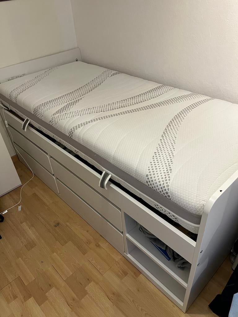 - Bed Ikea met opberger+lattenbodem+ matras, 90x200 cmIkea släkt nattapa met afzonderlijk aangekochte lattenbodem (in hoogte verstelbaar hoofdstuk), dikke stevige matras voor volwassene, 90x 200 + bijkomende zijsteunComme neuf Enlèvement