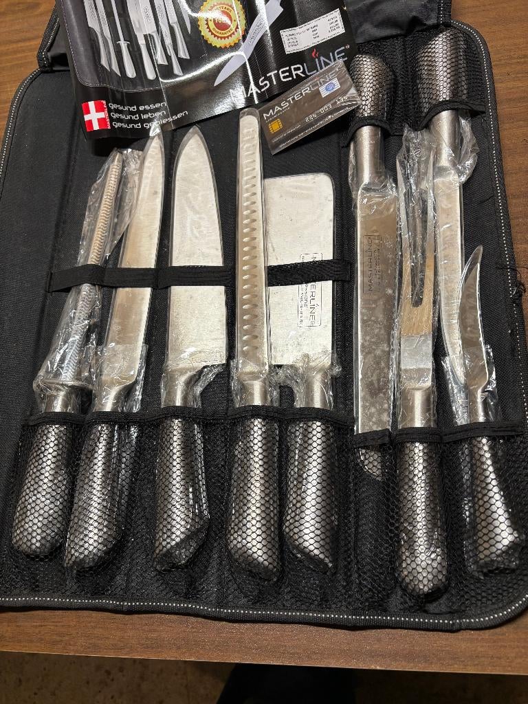 - Set de couteauxEnsemble de couteaux professionnels en acier inoxydable/acier inoxydable. L'ensemble se compose de 9 pièces. Dans un sac de transport pratique. Marque : masterlineNeuf Enlèvement