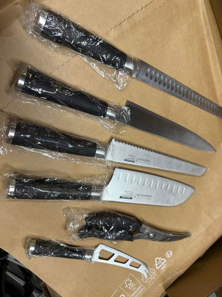9 janv. 26TinneBerlaar - 9-delige messenset Masterline exclusive edelstahlGeheel nieuwe, 9-delige messenset van het kwaliteitsmerk masterline, authentic master cooking, vervaardigd uit roestvrij staal. Alles zit nog in de originele verpakking, inclusief een mooie opbergkoffEnlèvement