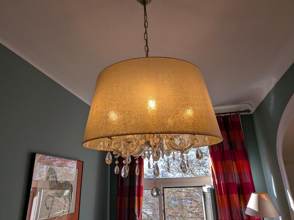 - Très beau lustre à pampillesTrès beau lustre, état impeccable. 60 Cm de diamètre 55cm de hauteur du haut de l'abat-jour au bas des pampilles a venir rue de la poste à schaerbeek. Faire offre à partir de 50 €Comme neuf Enlèvement