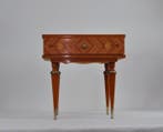 Aujourd'huiAnnonce au topVan houtteZulte - Armoire - BoisNachtstand et sideboard français vintage, période milieu du siècle, datant des années 1960–1970, en bois avec finition marron et marqueterie en chevrons/diamants sur le devant, pieds compas élancés et
