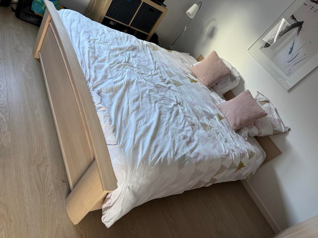 27 mars 26AntonioLa Louviere - Chambre à coucher Phaedra Chêne clairLit 140 + garde robe l217xh221xp62 + 2 tables de nuit - pas de matelas ni sommier. Décor : chêne français & nox. Valeur 1600€. Comme neuf : n'a servi que 2 mois. Déjà démontée, plus quComme neuf Enlèvement Deux personnes