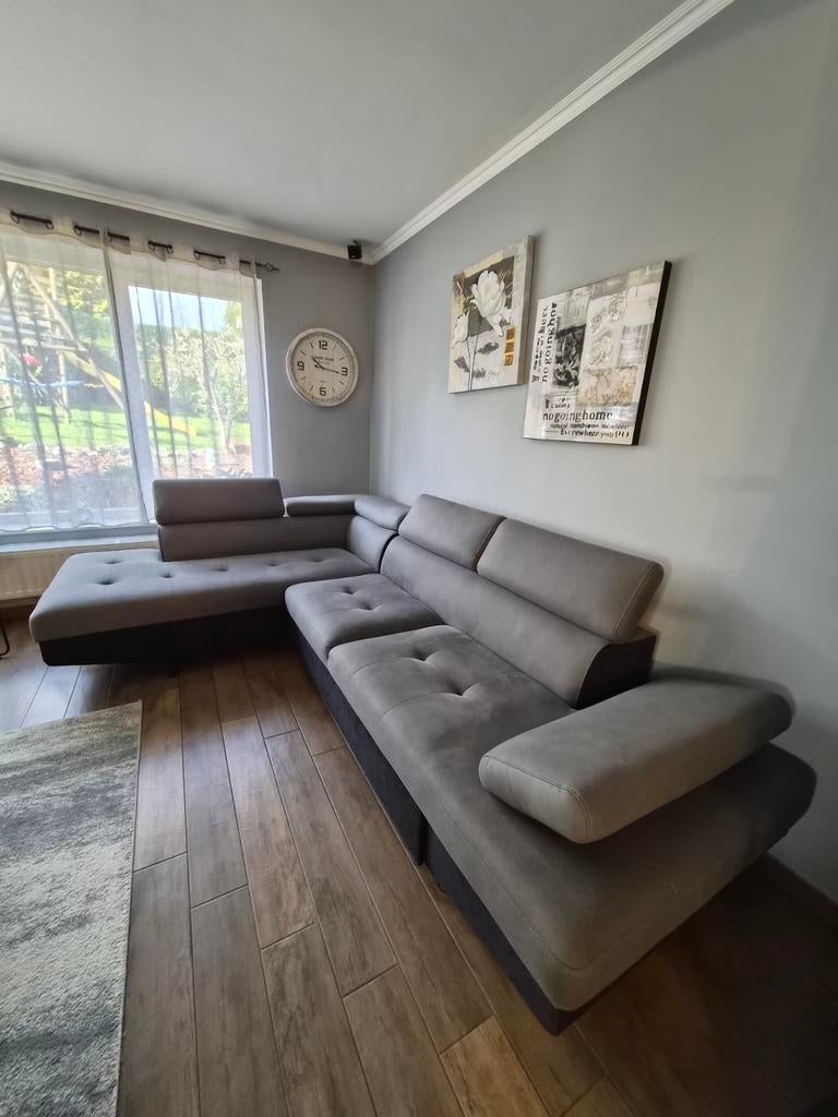 - Canapé en L convertible avec coffreMagnifique canapé en l convertible en lit de 2 personnes avec coffre de rangement. Etat comme neuf, pas d'affaissement ni de déformation quelconque. Tissu lavable. Voir les dimensions sur photos.Comme neuf Enlèvement